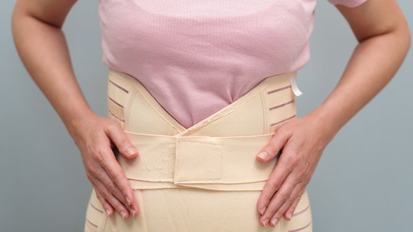 - Использовать бандаж или тейпы. В идеале с первого же дня возросшей активности необходимо подвязать живот, давая небольшую поддержку передней брюшной стенке и как бы приподнимая живот в нижней части. Для этого можно использовать длинный шарф, слинг, отрез х/б или льняной ткани. Как вариант подойдет и неширокий бандаж-лента. Главное — помнить, что цель этого подвязывания — не утянуть живот и не сделать его плоским (в этом случае мы получим «эффект тюбика» с «выдавливанием» органов малого таза вниз), а, наоборот, приподнять и дать опору снизу. При правильном подвязывании у вас должно быть ощущение, что вы мягко охватили ладонями ваш живот снизу, в области лобка, и чуть приподняли его. В первые дни после родов такое подвязывание поспособствует не только профилактике опущений, но и «соберет» таз, поможет вернуть прежнюю осанку. В среднем подвязываться стоит первые 10 дней, находясь в вертикальном положении. Отказаться от этой практики можно, когда ощущения с подвязкой и без нее будут одинаковыми. Прекрасная альтернатива подвязыванию живота — тейпирование, однако накладывать тейпы должен только специалист.