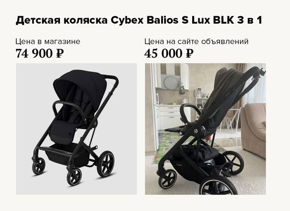 И все же экономия — одна из главных причин, почему родители приобретают товары с рук. Например, модную коляску премиум-класса Сybex на официальном сайте можно купить за 74 900 рублей (нужно будет еще доплатить за доставку), а на известном интернет-сервисе — за 45 000. Выгода — около 30 тысяч рублей.