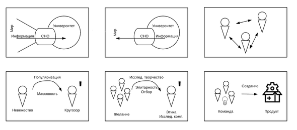 Из названий прямоугольников (слева направо по рядам) становится понятно, в чем их суть: информирование о внешних мероприятиях, информирование о событиях в университете, командообразование, популяризация, исследования, инновации.