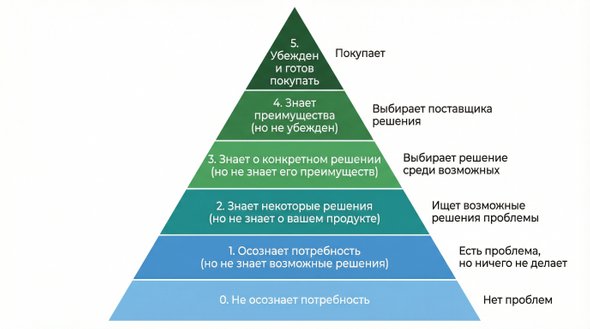 «Лестница Ханта» — это маркетинговая модель, разработанная Беном Хантом, которая описывает путь клиента от полного незнания проблемы до совершения покупки.