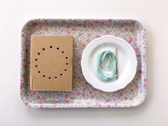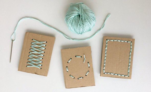 Вырежете из коробки квадраты размером 7×7 см, нарисуйте линии или геометрические фигуры. В местах, где пройдёт иголка, сделайте проколы. Лучше всего для этого подойдет шило, но можно и обычной иголкой. Покажите ребёнку, как делать стежки и предложите сделать это самостоятельно.