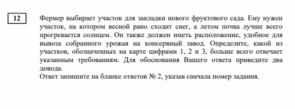 ✅ Правильный ответ: «Участок № 1, потому что он имеет склон южной экспозиции и находится рядом с шоссе».