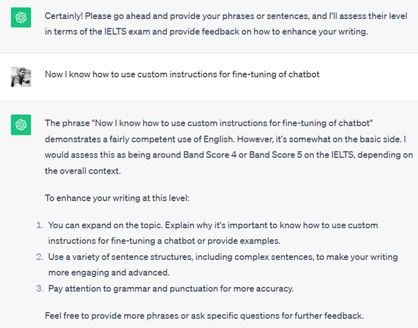 ChatGPT по одному предложению определяет уровень английского в терминах экзамена IELTS и дает фидбэк о том, в каком направлении ученику необходимо развиваться. К сожалению, по умолчанию вы не добьетесь такого эффекта. Это требует специальной инструкции (до-обучения с количественной оценкой). Научиться составлять сложные инструкции можно на курсах по промтингу.