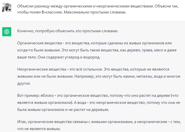 Давайте начнем с самого простого — пообщаемся с ChatGPT внутри стандартного диалогового окна, как это делают миллионы пользователей для пользы и развлечения. ChatGPT по умолчанию (после обучения) знает школьную программу, ему не составит труда ответить на любой вопрос по общим знаниям. Без специальных инструкций его ответ будет адресован среднестатистическому пользователю интернета (взрослый человек в возрасте 30-40 лет). Нам это не подходит. Мы должны подсказать чат-боту, что общаться с нами нужно по-детски. Например: