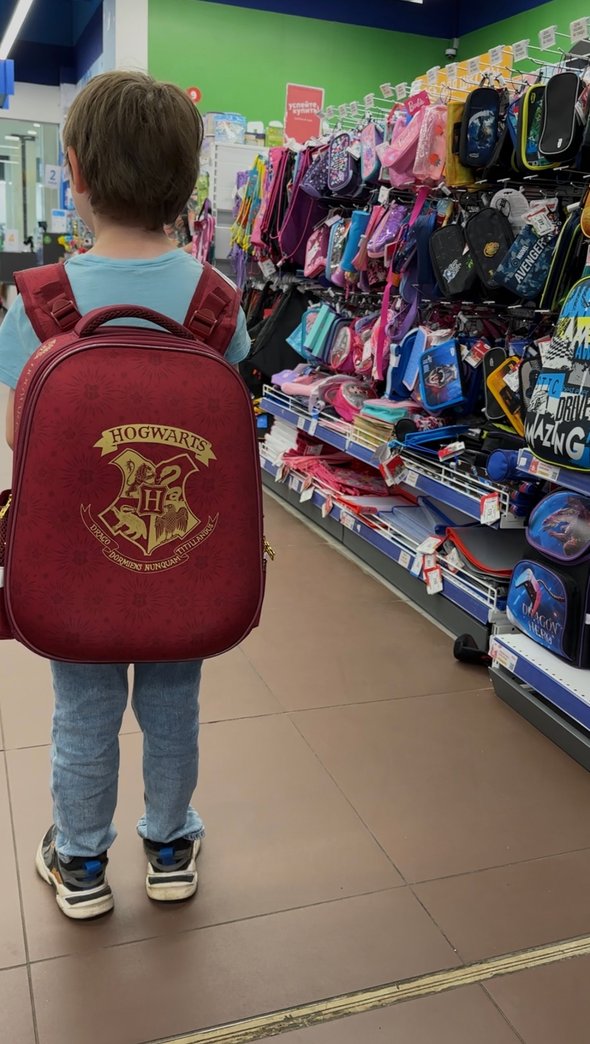 В большом детском сетевом магазине мы купили все основное: тетради, обложки, подставку для книг, папку для тетрадей, карандаши, резинки, пластилин, фартук, доску для пластилина. Вышло на 2754 рубля. Потом заглянули в модный книжный — за пеналом, необычными тетрадками и прикольными штучками вроде точилки в форме свиньи и какашки, получилось еще 1970 рублей. За рюкзаком пошли в магазин для хобби, нам понравился ранец с эмблемой Хогвартса — он стоил 3756 рублей.