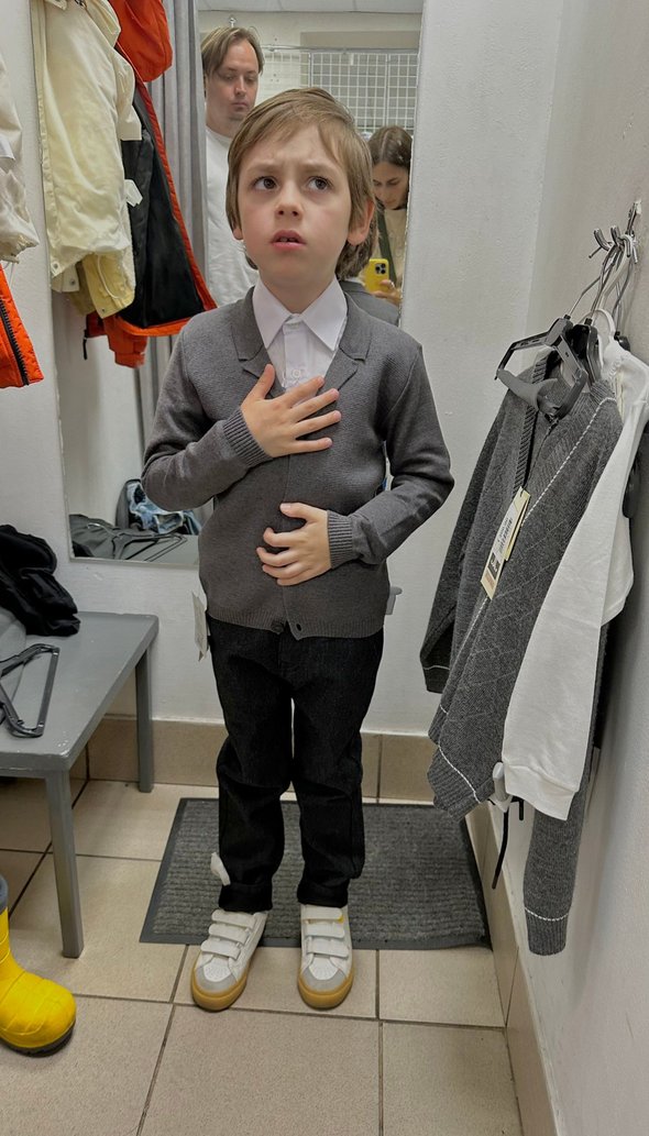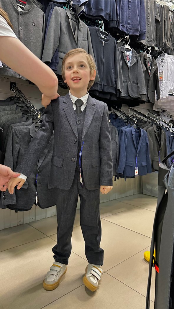Еще один день — одежда. В школе обозначили стиль и цвет: нам нужна серая форма классического кроя. Сперва мы поехали в самый старый магазин школьной формы в городе: мне самой здесь покупали одежду, когда я была маленькая. Судя по отзывам, там качественный пошив и хороший ассортимент. Приехали мы 30 июля, но серых костюмов нужного нам размера уже не было.