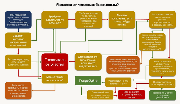 Мы подготовили схему, с которой можно свериться и понять, стоит ли участвовать в челлендже. Конечно, в ней представлены не все возможные варианты, поэтому главное правило — общаться с детьми, интересоваться, какие видео они смотрят, не отмахиваться, когда ребенок подбегает с телефоном и хочет показать милых котят или очередной тикток от любимого блогера.