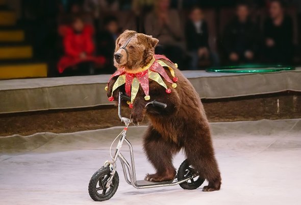 Больше всего возмущения в обществе вызывают способы, которыми зверей заставляют стоять вниз головой, крутить сальто на кольцах и делать другие удивляющие публику вещи. Сами посудите: медведь на велосипеде — где в природе такое встречается? Чтобы приучить зверя к такому трюку, используют метод «кнута и пряника»: на дрессировку, репетицию или представление его выводят голодным. Если животное не подчиняется или не понимает, чего от него хотят, его просто оставляют без корма до следующей репетиции. Рано или поздно полуголодный львёнок прыгнет за куском мяса на тумбу, а если захочет тут же сбежать, его накажут.