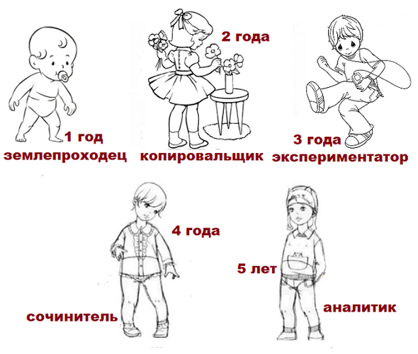 5. Аналитик. Желает разобраться в сути событий. Задает вопросы, интересуется подробностями, рассматривает картинки в книжках, любит мультики, готов обсуждать сказки, а в играх любит изображать ситуации, которые сам сочиняет по ходу игры. При ответе на задаваемые вопросы способен дать аргументацию. Интересуется жизнью взрослых, хочет присутствовать при их разговорах.