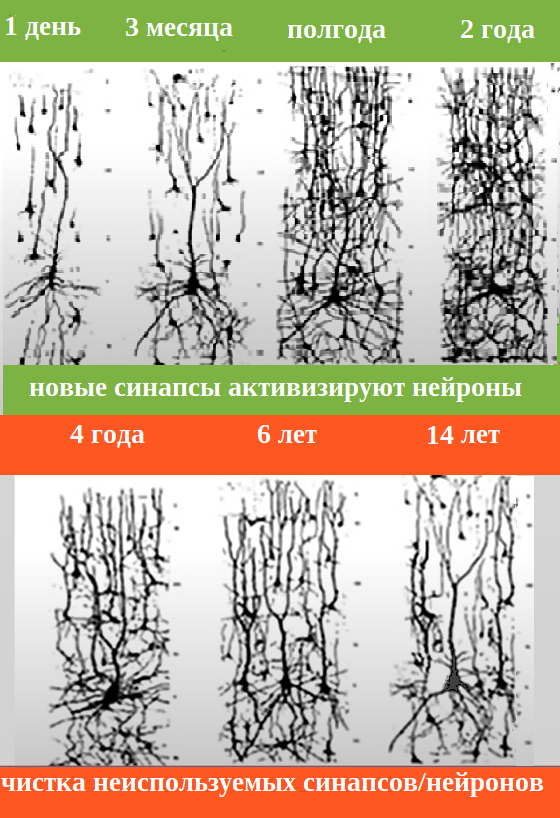 Ребенок наблюдает мир, а в его мозгу каждую секунду возникает около 40 тысяч контактов, формирующих синапсы для активизации информации, записанной в нейронах. Часть образовавшихся синапсов потом не будет востребована, а их присутствие будет мешать работе мозга. Природа предусмотрела чистку, которая нацелена на ликвидацию того, что долго не используется. Если какие-то синапсы сформировались, а потом не задействованы для передачи сигналов от клетки к клетке, то они удаляются, а тогда теряется ранее сформированная связь между нейронами. Если какой-то нейрон долго не получает сигналов от других нейронов, то его влияние на работу мозга будет ослаблено так сильно, что синапсы, проводящие сигналы от него, бездействуют, а тогда ни один из нейронов не получит от такого нейрона ни одного сигнала. Для каких-то нейронов может возникать парадоксальная ситуация, когда они живы, но другие нейроны их не замечают.