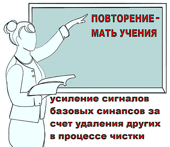 Что происходит с синапсами на уроке в школе при повторении ранее пройденного учебного материала? Возбуждается та же группа нейронов, которая была использована ранее. В ходе выполнения задания ищется кратчайший путь между нейронами, приводящий к нужному результату. Кратчайший путь означает, что синапсов задействовано меньше, при этом энергетические затраты ниже, а ответ для учителя будет сформирован быстрее. Мы все радуемся быстроте ответа, так как он для нас означает успешное усвоение учебной темы. Естественно, мы желаем получать отличные оценки, которые даются при быстроте ответа, но в это время мы не думаем о синапсах. А ведь в мозгу одновременно производится чистка с удалением тех синапсов, которые оказались избыточными для решения стандартных задач. Приходим к парадоксу, когда упрощение связей с ликвидацией синапсов приводит к более высоким отметкам при проверках знаний учащихся.