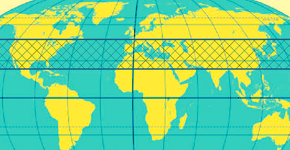 На карте выделена полоса с наилучшим климатом для жизни человека. Зоны, приближенные к полюсам и к экватору, менее благоприятны. Так показывает статистика для северного полушария, а для южного она отсутствует.