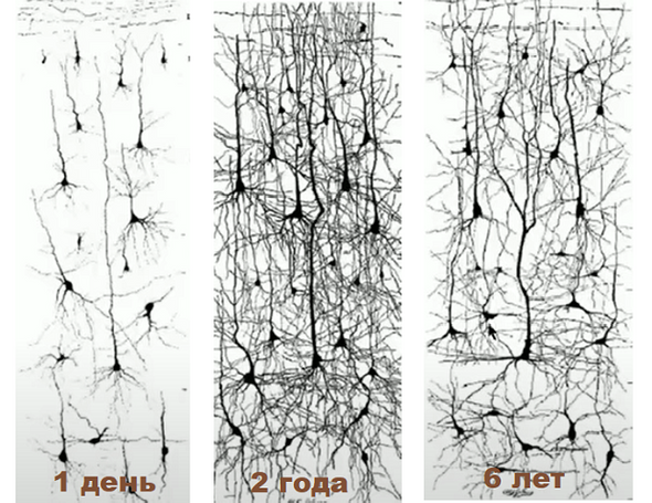 Из этих снимков видно, что в раннем возрасте число нейронов и связей между ними растет, а потом нейронная сеть становится менее плотной. В этом смысле родительские гены порождают более высокие задатки для формирования таланта, чем окажется потом в результате процесса взросления. Новые нейроны нарождаются при обучении и активизируются под решение конкретных задач. Какие-то из них отомрут, если не создадут достаточно активных связей с другими нейронами. Сколько нейронов окажутся не востребованными и погибнут? Какой густоты будет нейронная сеть? Это зависит от тех контактов, которые происходят в первую очередь в семье и в школе.
