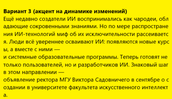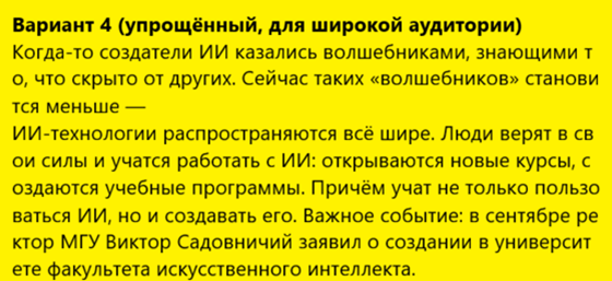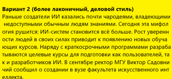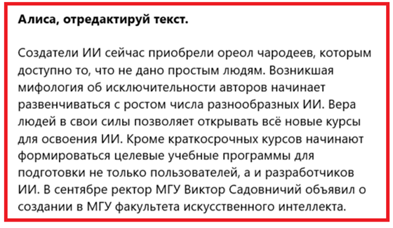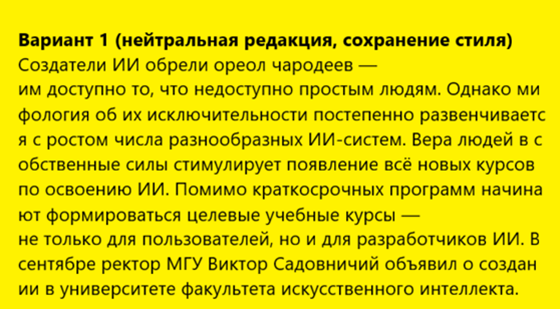 В качестве примера ниже приведён отрывок текста с вариантами его редакции. Редактирование произведено Алисой AI. Тексты, которые сформированы ИИ, приводятся на жёлтом фоне, чтобы их не перепутать с текстами, написанными людьми.