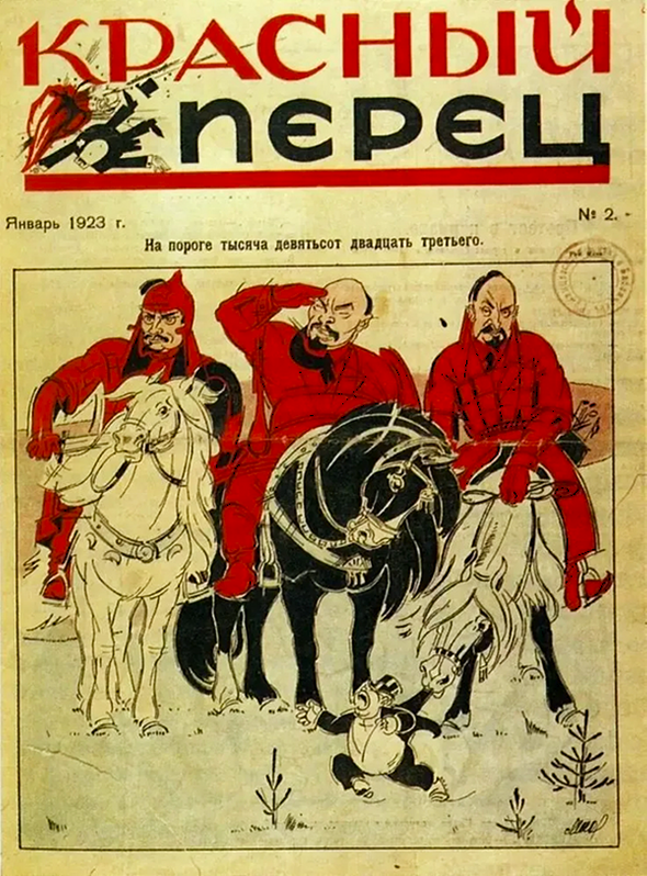 Аналогичный приём был использован в журнале «Красный перец» в январе 1923 года, когда на его обложке изобразили трёх руководителей советского государства: Троцкого, Ленина и Каменева.
