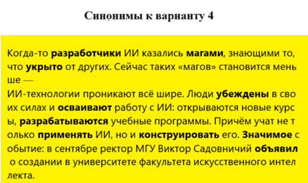 Итак, студент отредактировал выбранный для плагиата текст, а после этого продолжит совершенствовать свой плагиат, стараясь его сделать как можно менее схожим с заимствованным текстом. Следующий шаг — это замена части слов на их синонимы. Опять же в этом ему окажет помощь Алиса AI. К тому же Алиса AI бескорыстна и денег за этот труд не требует.