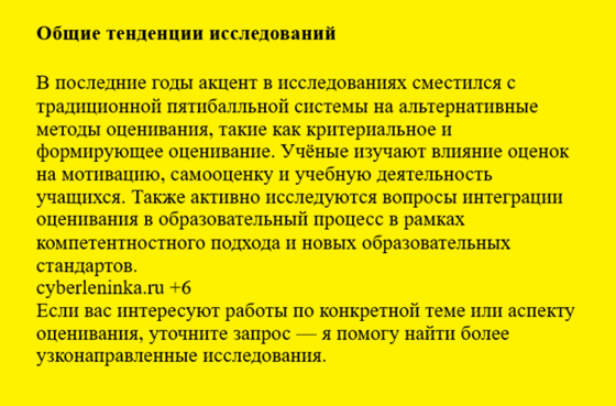 Итак, студент может не «париться» над проблемой, заданной научным руководителем, а будет создавать плагиат, но вначале для этого он будет искать текст, который соответствует теме курсовой работы. Предположим, что курсовая работа связана с оценочной системой в школе. Алиса AI на запрос «назови научные работы за последнее десятилетие, в которых про оценки школьных знаний» указала на 5 статей, а в конце дала дополнительный комментарий. Ниже приведены комментарий из конца списка и описание первой статьи из этого списка.