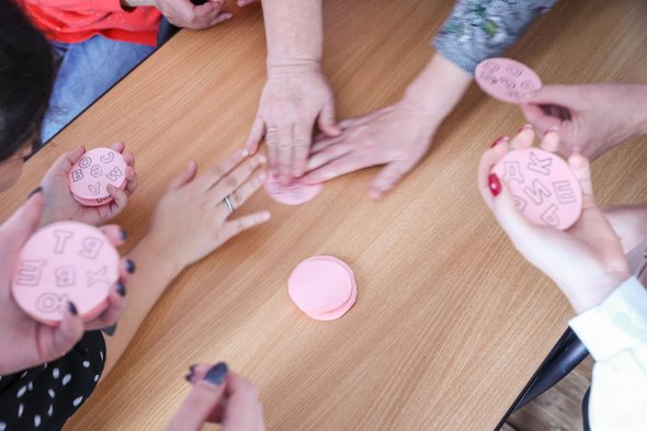 Еще одна игра — буквенный доббль — направлена на противоположное умение: вспоминать звук, видя букву. Этот навык нужен уже для чтения. У нас в материалах есть несколько наборов буквенных добблей со всё увеличивающимся количеством букв. Детям надо быстрее всех на своей карточке найти ту же букву, что и на той, которая на кону, громко назвать ее и накрыть карточку ладонью. Игра азартная и очень нравится детям. Учителя нашей программы учили детей играть в эту игру и потом давали ее им на перемене — дети с удовольствием играли сами.