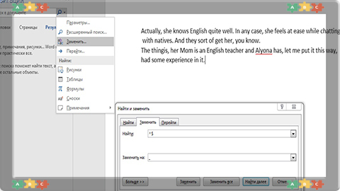 c) Тыкаем на стрелочку рядом с поиском ▼ или на лупу и выбираем «Заменить».