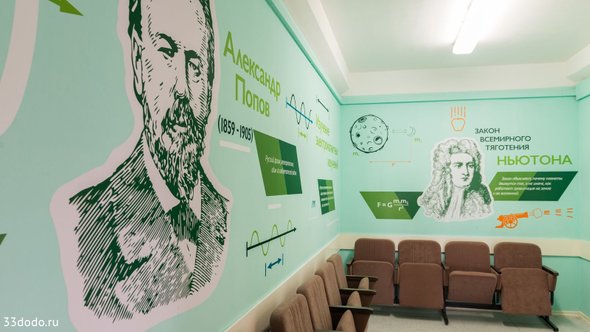 Коридор оформили вдохновляющими материалами об учёных, которые сделали глобальные перевороты в науке: Исаак Ньютон, Альберт Эйнштейн, Мария Кюри, Александр Попов, Никола Тесла. На стенах — суть главного открытия учёного, его цитаты.