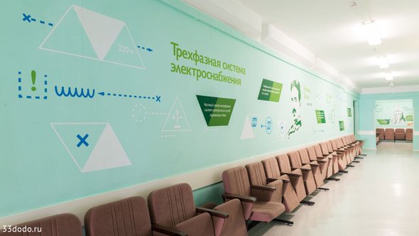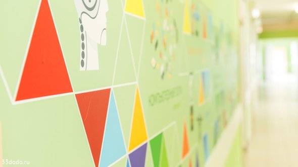 Оформление первого этажа мы сделали в теме «город будущего», показали основные тенденции развития в профессиях и областях науки.