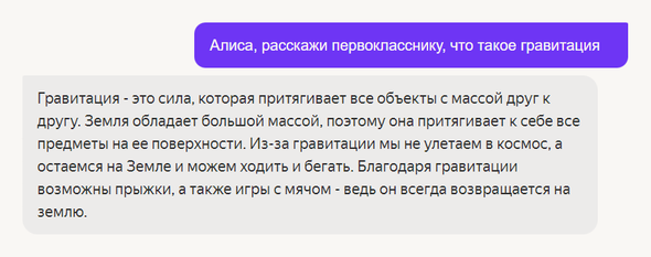 Дети задают много вопросов. И даже если родитель знает, почему по Земле люди ходят, а в космосе парят, объяснить это маленькому ребенку бывает непросто. Не всегда помогает и поисковик: на то, чтобы найти достоверную информацию, написанную доступным языком, порой уходит много времени. Тут поможет ИИ. Вы можете попросить: «Алиса, расскажи первокласснику, что такое гравитация».
