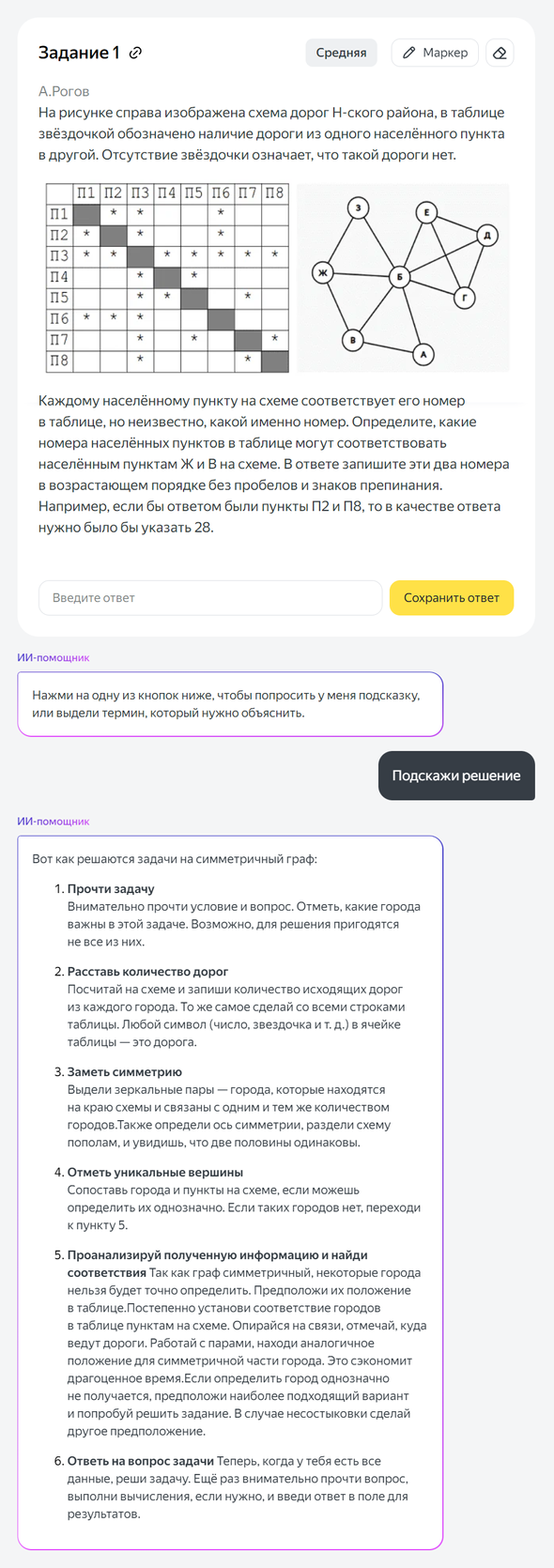 Использование ИИ развивает самостоятельность, ведь ребёнок перестаёт полностью зависеть в учёбе от педагога или родителя. С виртуальным помощником он будет заниматься в интересном для него формате когда ему удобно. Например, выпускники могут готовиться к экзамену по информатике на платформе ЕГЭ по информатике с Яндекс Учебником со встроенным ИИ-помощником.