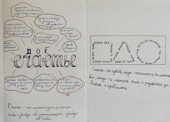 С семиклассниками мы поработали с определением слова «счастье» на уроках родной литературы. Сначала обсудили представления героини рассказа, а затем попробовали поделиться своими мыслями — фокусируя внимание на деталях, нарисовать с помощью слов образ счастья. Получилось очень интересно! В работу были вовлечены все. Кто-то из учеников, вспомнив о фигурной поэзии, использовал в ответе геометрические формы, кто-то попробовал свои силы в леттеринге — искусстве художественного прорисовывания букв.
