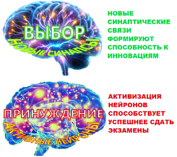 Мозг нельзя заставить создавать инновации. Можно заставить выполнять механические действия: копать яму, читать текст, стучать по клавишам пианино, но нельзя приказать нейронной гиперсети ребенка формировать связи для выхода на следующий уровень эмерджентности. Родитель лишь создает условия, чтобы синаптические связи между нейронами формировались. Новые связи в нейронной гиперсети формируются на базе лишь самостоятельных решений при наличии нескольких вариантов, а задача родителя создать для этого условия.