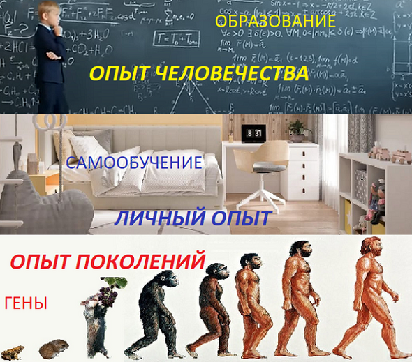 В реальности нейроны перемешаны между собой, а разбивка мозга на цветные сектора условна, чтобы продемонстрировать поэтапное заполнение нейронной гиперсети информацией разного типа. Информация, сформированная генетикой, является информацией, зафиксированной на основе опыта предыдущих поколений. В частности, генетикой заданы правила и первичные признаки для записи информации в нейронной гиперсети. Информация для самообучения в основном поступает из окружающей среды, отражая личный/субъективный опыт в контактах с окружающей средой. Образование вводит в нейронную гиперсеть информацию, наработанную человечеством в целом, которую не получится сформировать лишь на личном жизненном опыте.