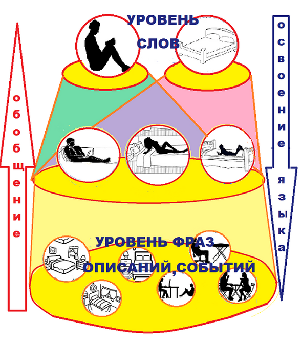 До освоения речи процесс самообучения был направлен от событий к обобщениям: слово услышано в одной ситуации, потом в другой, потом в третьей, а обобщение этих ситуаций сопоставляется с услышанным словом. При освоении речи процесс, формируемый в мозгу ребенка, направлен от обобщений, которыми являются слова и простые действия, к отдельным событиям.