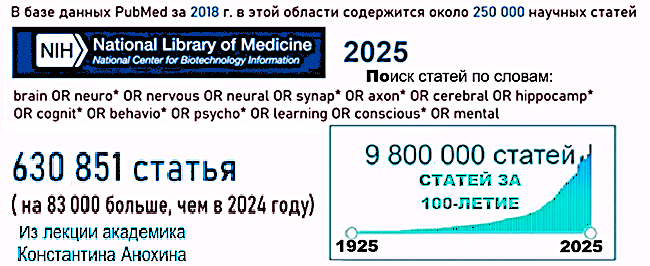 Введение ИИ в практику повседневной работы обусловлено не простым желанием облегчить выполнение заданий. Оно связано с ростом той информации, которая используется в профессиональной деятельности. Директор Института перспективных исследований мозга МГУ имени М. В. Ломоносова академик Константин Анохин начинает свою лекцию по итогам науки за 2025 с демонстрации роста научных статей.
