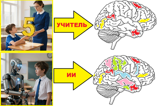 Исследования состояния мозга в зависимости от учёбы с ИИ и без него демонстрируют результаты в пользу подключения к учебным занятиям ИИ. В одном из исследований были задействованы две группы, где в одной был разрешён ИИ, а в другой он отсутствовал. В одной группе ИИ выдавал визуальный ряд нового материала, а ученики должны были отвечать на вопросы от ИИ. В другой группе учитель объяснял материал, а потом опрашивал учащихся. При работе с ИИ мозг всё время активен, так как ИИ молниеносно реагирует на ответ ученика. А в другой группе при работе с учителем мозг активен при получении задания, но его активность резко падает при ответах других учеников. При тестировании на объём знаний выигрывала группа без ИИ, но группа с ИИ выигрывала в тестах по сложности успешно завершённых заданий. Обучавшиеся с помощью ИИ легко получали результаты даже по тем заданиям, которые были не по силам даже отличникам из группы, где учёба шла без ИИ.