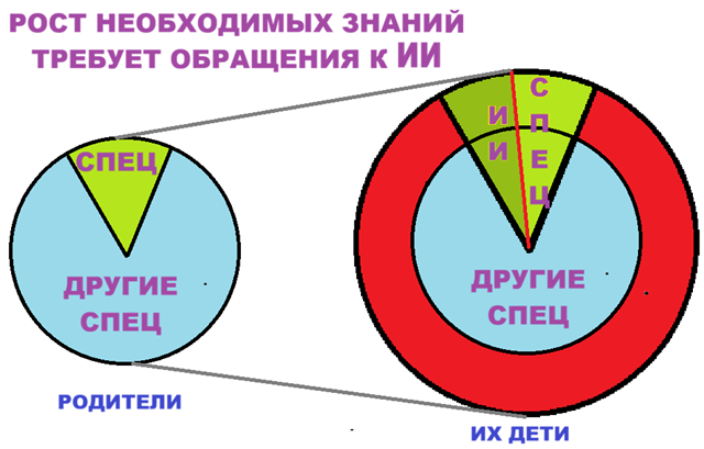 При другой поломке бытовой техники ребёнок справится без родителя, что будет означать овладение возможностями ИИ для решения бытовых проблем. Обращаю внимание, что при этом ребёнок вряд ли запомнит названия деталей, как это происходит на занятиях с учителем в классе. Другой ребёнок после занятий в классе без навыков ИИ не освоит принципы ремонта бытовой техники, но зато у него будут выше показатель IQ, который высок благодаря выученному названию деталей, хотя и без умений ликвидировать неисправность прибора.