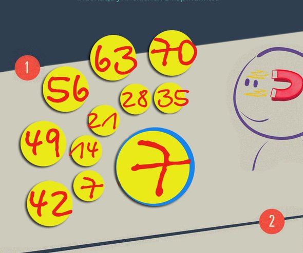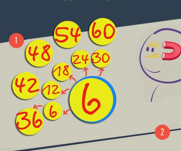 Когда с умножением на 5 разобрались, можно переходить к 2,4 и 6, Я объяснила, что 2*6 — это сумма равенств 2*5 и 2*1. То есть умножаем на 5 и добавляем «хвостик» от первого круга. Так срабатывает умножение на все четные цифры.