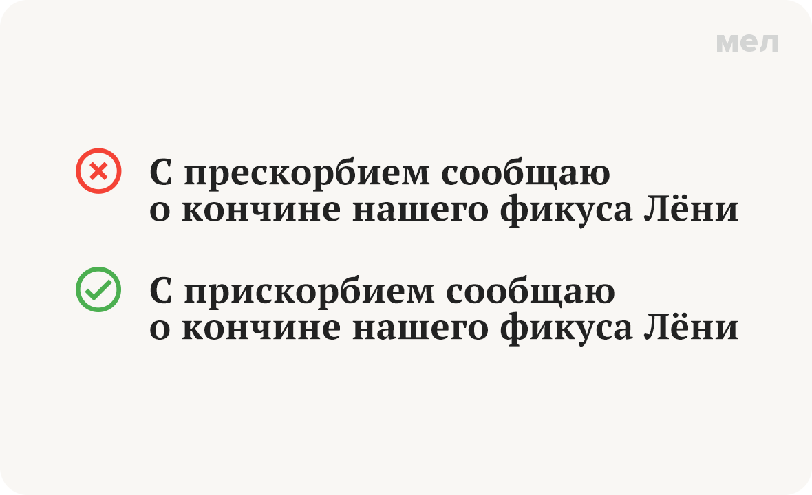 Иначе говоря, прискорбеть — приступить к скорби, едва в нее погрузиться. Сообщая о чем-то с прискорбием, мы на самом деле ставим окружающих в известность, что мы порядочные люди и уже приступаем к трауру.