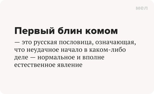 Таким образом, у новой трактовки старой поговорки нет фактических подтверждений. «Первый блин» — по-прежнему «комом». Первый блин часто действительно получается скомканным из-за плохо разогретой сковородки, недостатка или, наоборот, обилия масла. Равно как и дебют в любом деле редко когда обходится без ошибок.