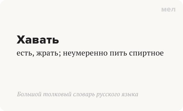 - Хавать — кушать (цыганск. хав, халем, хавас — «есть»).