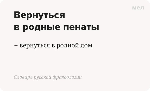 Считается, что слово penates происходит от penus («кладовая») — так называлось помещение для хранения запасов еды. Строго говоря, это устойчивое выражение закрепилось в русском языке в не совсем корректной форме. Если пенаты — это духи, логичнее было бы возвращаться «к ним», а не «в них». Однако для многих фразеологизмов допустимо некоторое игнорирование правил — и это один из таких случаев.