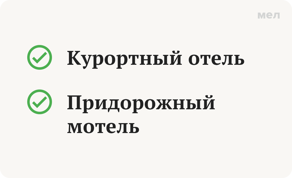 Мотель же — это маленькая гостиница у трассы, где в основном останавливаются автомобилисты (и чаще всего на одну ночь). Как правило, это небольшое одно-двухэтажное здание с ограниченным количеством комнат. В классических американских мотелях вход в каждую комнату расположен с улицы, прямо с парковки автомобиля. У нас такой формат менее распространен, часто мотель — это просто небольшое здание с недорогими комнатами на ночь и без классического отельного сервиса.