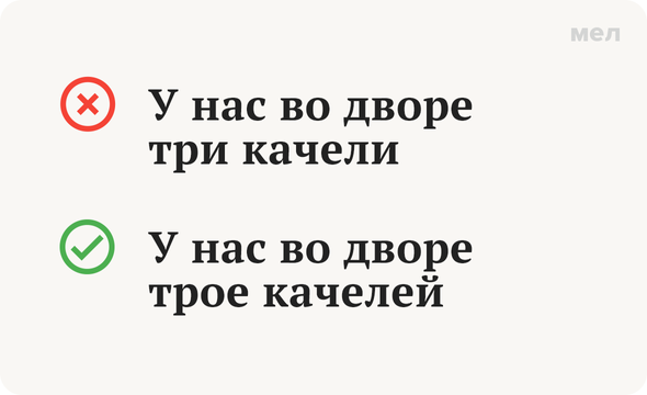 Важно: в косвенных падежах (помним, что это все падежи, кроме именительного) вместо собирательных используются уже количественные числительные: мы говорим не о «троих», а о «трех качелях», во дворе не хватает не «двоих», а «двух качелей» и так далее.