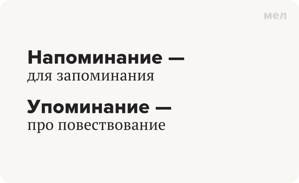 Оба слова могут встретиться вам в том числе в смартфоне. Напоминанием будет, например, уведомление, помогающее не забыть что-то важное (в офлайн-жизни это скорее родительское «надень шапку»). А упоминание может появиться в соцсетях, когда кто-то отметил ваш профиль в посте или сообщении — то есть вскользь назвал или обозначил причастность. Хотя, кажется, в ситуациях, когда ребенок невзначай говорит, какой подарок он хочет на день рождения, упоминание превращается в напоминание. Но не давайте себя запутать!
