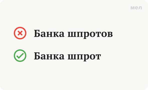 Теперь перейдем к основному вопросу: как правильно — «банка шпрот» или «банка шпротов»? Как это часто бывает в русском языке, оба варианта считаются допустимыми, но, согласно «Словарю грамматических вариантов русского языка» Л. К. Граудиной, в родительном падеже множественного числа предпочтительно говорить «шпрот», «банка шпрот».
