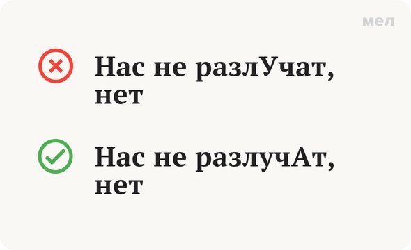 Встречайте группу «Мираж» с песней «Музыка нас связала». В ее начале героиня просит не читать ей нотаций и говорит, что спор не нужен никому. Но мы вместе с читателями никак не можем удержаться. Цитируем: «Всем уговорам твержу я в ответ: // „Нас не разлУчат, нет!“» Всё правильно: конечно, не разлУчат. Потому что нужно произносить «разлучАт»! Именно такой вариант ударения зафиксирован в словарях — и он считается единственно верным.