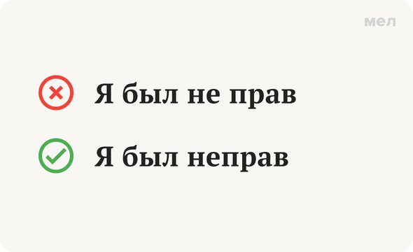 В нашем примере мы скорее утверждаем отрицательный признак и точно можем заменить слово «неправ» синонимом без «не» («я ошибался») — поэтому пишем его слитно.