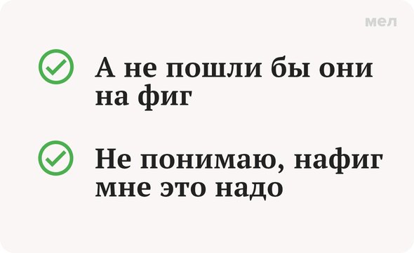 - Когда уточняете, с какой целью нужно куда-то идти или что-то делать, — пишете слитно (Не понимаю, нафиг мне это надо).