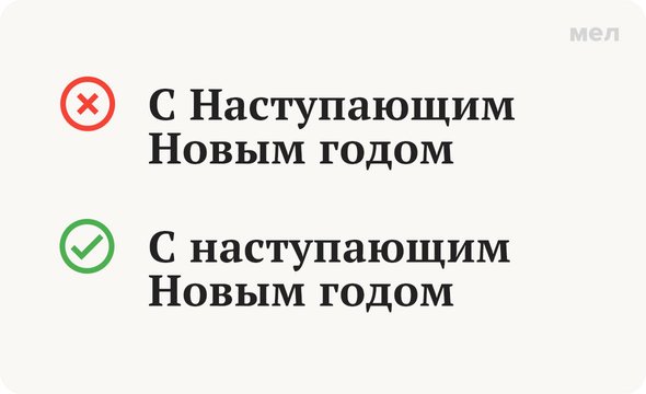 Второе. Хотите поздравить кого-то заранее? Имейте в виду: слово «наступающий» не входит в название праздника и всегда пишется со строчной буквы: