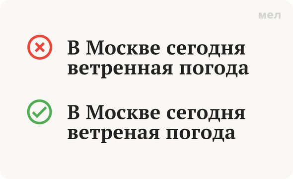 Еще иногда по ошибке пишут «ветряная погода». Прилагательное «ветряной» тоже существует, но только не в значении чего-то связанного с ветром (или как синоним слова «легкомысленный»), а когда мы говорим о том, что приводится в действие с помощью ветра. Звучит сложно, но вот вам примеры, чтобы сразу стало понятно: ветряной двигатель, ветряная мельница.
