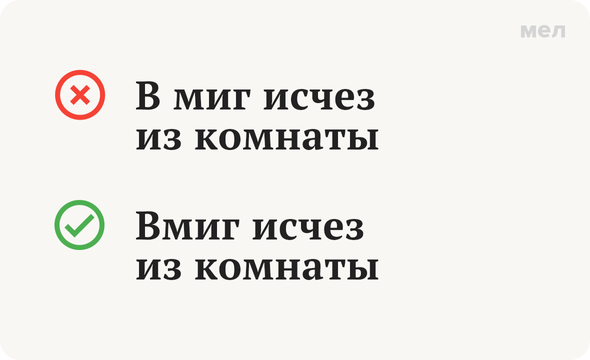 Соответственно, в тех случаях, когда мы говорим о некоем (обычно коротком) временном промежутке, который называем «миг», — пишем раздельно. Когда хотим сказать, что что-то произошло очень быстро, — пишем слитно.