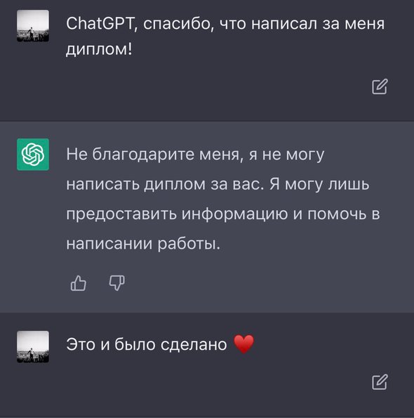Юноша объяснил, что диплом считает «переоцененной» задачей, на которую не хочется тратить много времени. Чтобы избавить себя от необходимости провести несколько недель за написанием текста, выпускник предпочел передать эту задачу нейросети ChatGPT, с которой он взаимодействовал на английском языке.